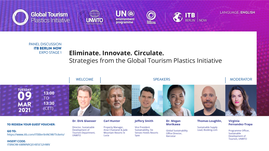On the occasion of its first anniversary, the World Tourism Organization (UNWTO), the United Nations Environment Programme (UNEP) and the Ellen MacArthur Foundation co-organized the panel discussion on “Eliminate.Innovate.Circulate. Strategies from the Global Tourism Plastics Initiative” at ITB Berlin Now. The panelists discussed how addressing plastic waste and pollution, building on circular principles, can support a responsible recovery from the COVID-19 pandemic and shared strategies and actions that they are implementing to achieve their commitments. New signatories (15 organizations) were also welcomed to the initiative.
